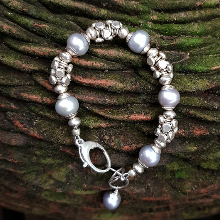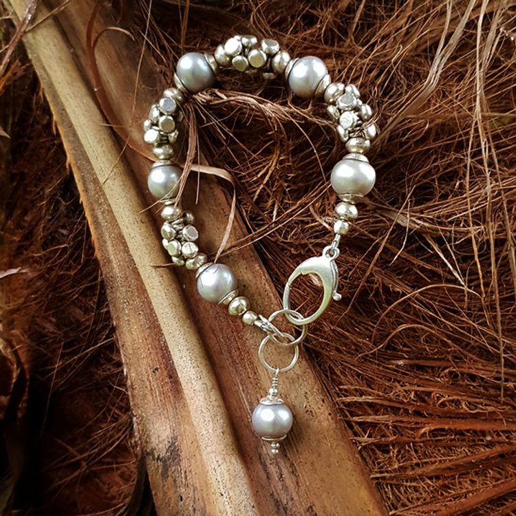 Fine silver bracelet with grey fresh water pearls and fine silver dumbbell-shaped beads.